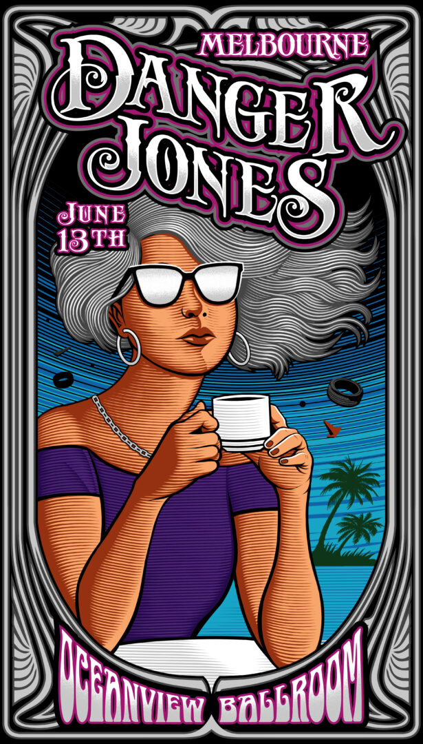 Client: Danger Jones ·Here is the packaging art that I created for the hair coloring company, Danger Jones. Danger Jones uses the graphic style of gig posters in their packaging. Each hair color has its own gig poster artwork for the fictional band, Danger Jones. These poster illustrations includes fake venues and dates so they look like actual concert posters.