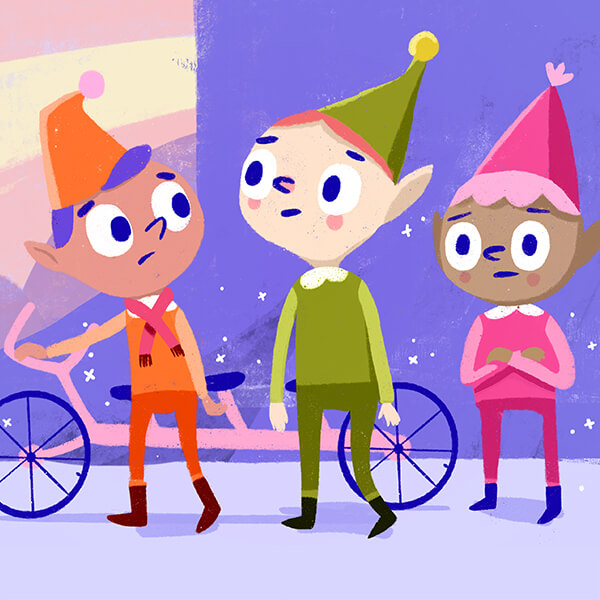 Client: Pinna ·This is a kid's podcast cover for a story about elves in Central Park who are no longer noticed, so they make a plan to be seen again! The goal of this illustration was to have strong appeal to kids aged 3-8, and set the tone of the podcast, since it is the only visual representation of the story. It also would be viewed in a range of sizes, mainly on phones and tablets, so had to make an impact in varying small scales.