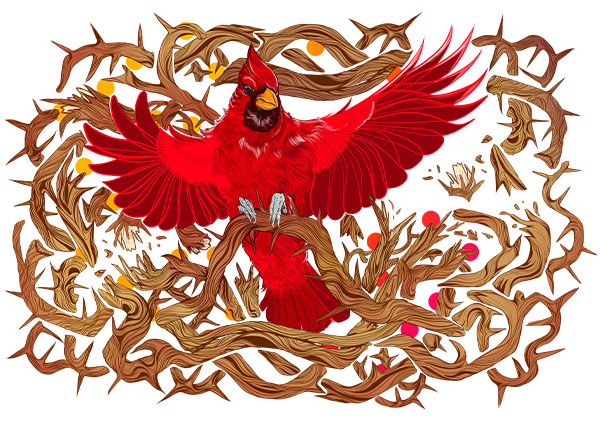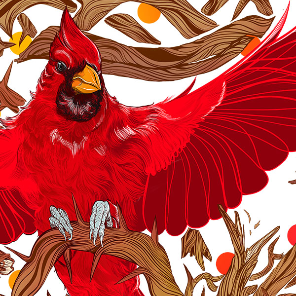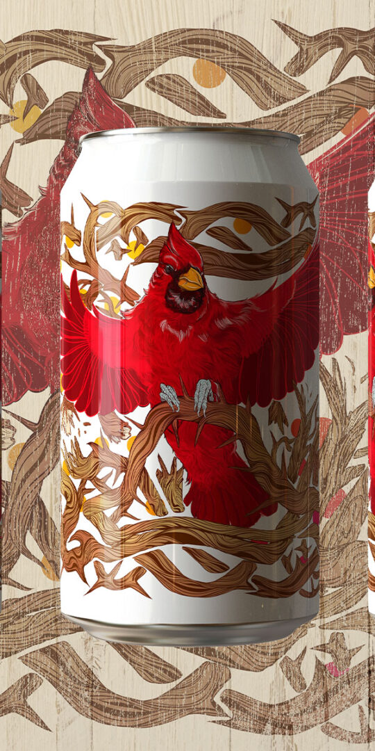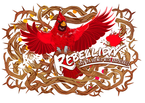 Personal Work ·I've started a new project for my Patreon members called Cardinal Thoughts Brewing. It is a virtual brewery completely designed by me alongside my fan base. Logo designs, labels, posters, even bar layout, and construction will be a part of this journey. I decided to start with this label, a recipe that I've been wanting to try for a long time.Rebellion Hazy IPA is a sharp kick of raspberry flavor that keeps you asking for more! Like the bright piercing whistle of a cardinal defending its territory, it screams: I will not be contained! I will not be taken advantage of! See me!This piece is a love affair with my favorite bird and my love of detailed repeating linework. From the individual feathers along the down belly to the wrapping thorny vines it is a pleasure to look at with plenty of little details to get lost in.Done digitally in Adobe Fresco and Photoshop.