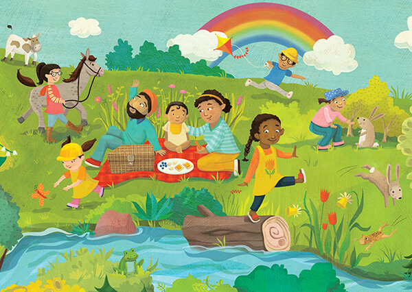 Client: World Vision ·My most recent project for World Vision was an intricate spring scene, full of life and action, which was used to create a poster bounceback (the gift that a sponsor can send to their sponsored child). I needed to include many hidden objects and "can you spot" details throughout the piece, as well as connect four separate scenes (garden, meadow, lake and forest) with multiple families and springy nature and wildlife elements as well. Flowers, sunshine, animal babies and butterflies... a perfect project for cold January days! So happy to know it is now in the hands of kids around the world.